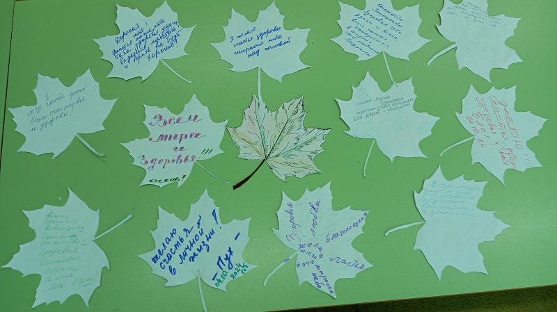 Они изготовили открытки в виде жёлтого кленового листочка , где на обратной стороне листочка написали пожелания крепкого здоровья, благополучия и удачи.