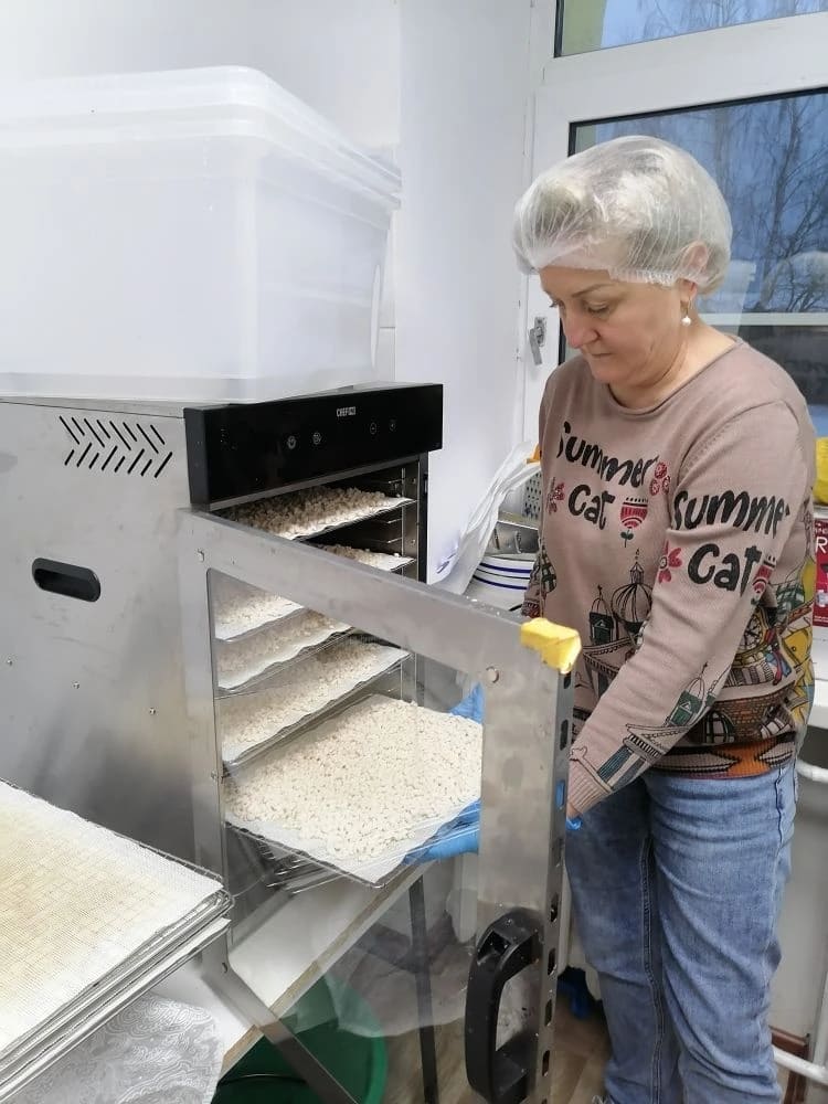 Сотрудники отделения "Специализированный жилой дом для граждан пожилого возраста и инвалидов" ГБУ "КЦСОН Краснобаковского муниципального округа" продолжают сушить продукты для изготовления сухих супов, отправляемых в зону действия СВО