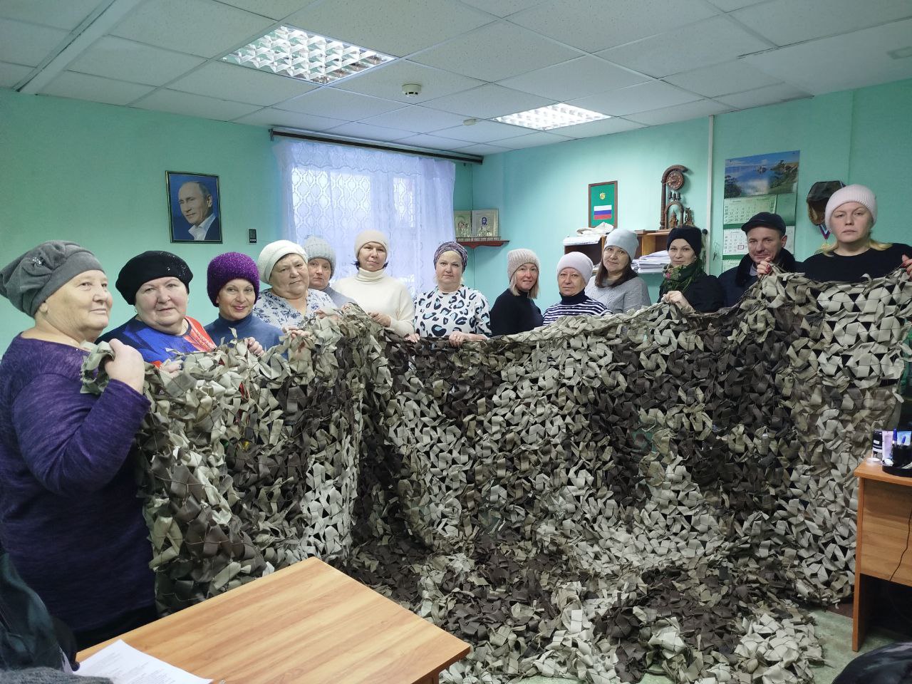 Социальные работники п. Шеманиха изготовили десятую по счету маскировочную сеть для отправки в зону действия СВО.