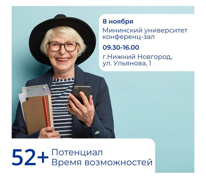 8 ноября 2024 г. (с 09.00 до 16.00) в конференц-зале Мининского университета (г. Нижний Новгород, ул. Ульянова, 1) состоится уникальное событие для представителей зрелого возраста «52+: Потенциал. Время возможностей» с участием спикеров из Нижнего Новгорода, Москвы, Оренбурга.